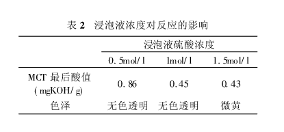 浸泡液浓度的影响见表2(反应6小时后结果),可知浸泡液浓度达到lmol/1时趋于稳定,增加浓度对反应速度没什么影响,浸泡液浓度增加到1.5.nol/1时产品最后的颜色加深,因此,硫酸浓度为1mol/1时最佳。