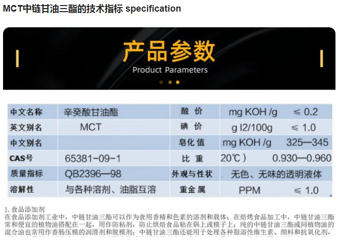 中链甘油三酯简称MCT,它自然存在于棕榈仁油、椰子油等食物和母乳中。它是膳食脂肪的来源之一。主要成分是“辛酸甘油酯”。可用于食品、烘焙、化妆品溶剂、特殊医用食品、保健食品等。