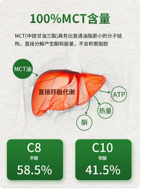 比起「长链」脂肪酸,MCT分子结构很小。这使得它能够绕过一系列复杂的代谢过程,直接进入肝脏进行代谢,在不转化为脂肪储存的情况下快速产生能量。