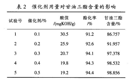 从表2看出,在一定范围内,甘油三酯含量随着催化剂用量增加而增大,催化剂用量太少,催化效果不好,催化剂太多,对甘油三酯含量提高不明显,因此催化剂用量控制为辛癸酸质量的0.3%为宜。