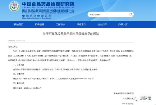 2021年1月22日,为进一步加强化妆品原料安全监管,根据国家药品监督管理局工作部署,中国食品药品检定研究院对《化妆品禁用原料目录》等文件进行了修订,发布《化妆品禁用原料目录(征求意见稿)》、《化妆品禁用植(动)物原料目录(征求意见稿)》,面向社会公开征集意见。